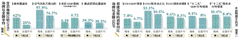 在保护青山绿水中实现经济较快增长。评价经济增长不仅要看速度,更要看质量。“十二五”海南GDP年均增长9.5%,高于全国平均水平1.5个百分点,并且这一速度是在严守生态底线、生态环境不断改善中取得的。2015年,海南森林覆盖率达到62%,比2010年提高2个百分点,比全国平均水平高出37个百分点;空气优良天数比例达到97.9%,高于全国平均水平约21.2个百分点;2010-2015年,海南单位GDP能耗降低26.9%,降至每万元消耗0.591吨标准煤,为同期全国平均水平的82.2%。(见表一)