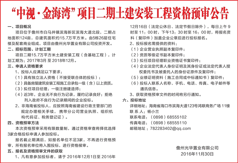 “中视·金海湾”项目二期土建安装工程资格预审公告