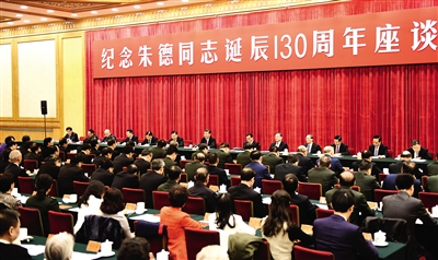 新华社北京11月29日电 (记者邹伟 崔清新)中共中央29日上午在人民大会堂举行座谈会,纪念朱德同志诞辰130周年。中共中央总书记、国家主席、中央军委主席习近平发表重要讲话强调,实现中华民族伟大复兴,是老一辈革命家和千千万万革命先辈毕生奋斗追求的目标。全党全军全国各族人民要更加紧密地团结在党中央周围,同心同德,锐意进取,顽强奋斗,继续把革命前辈开创的伟大事业推向前进,为创造更加灿烂辉煌的明天而努力奋斗。(讲话全文见A02版)