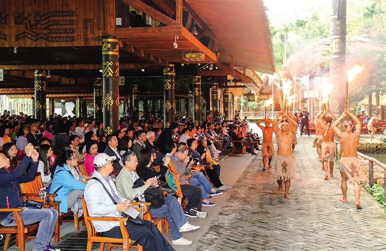 11月27日,由香港、澳门百余名旅行商组成的海南旅游考察踩线团,来到海南槟榔谷黎苗文化旅游区,观看《槟榔·古韵》演出,挖掘海南黎苗文化特色资源。本报记者 武威 通讯员 潘达强 摄