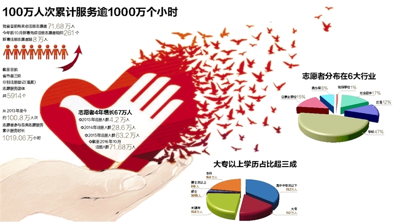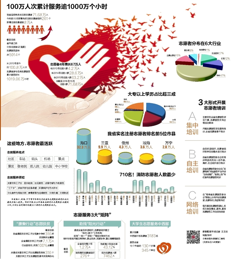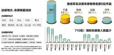 据悉,海南志愿者主要包括社会志愿者、企业志愿者、高校志愿者、机关党员志愿者等。目前全省志愿服务地点涉及社区、车站、码头、机场、景点、景区、敬老院、孤儿院、幼儿园、中小学校等上百个,服务类别包括关爱农民工子女、阳光助残、社区服务、邻里守望与为老服务、“三下乡”、扶贫开发与应急救援、环境保护与节水护水、文化宣传与网络文明、禁毒教育与法律服务、文明交通、文明旅游等领域。