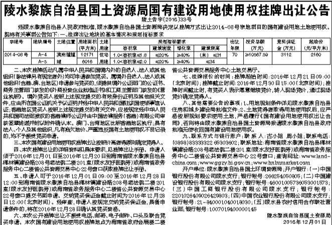陵水黎族自治县国土资源局国有建设用地使用权挂牌出让公告