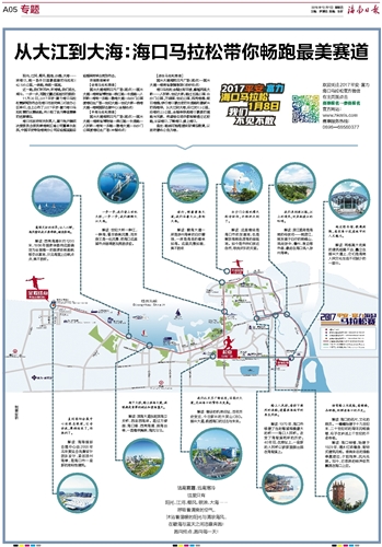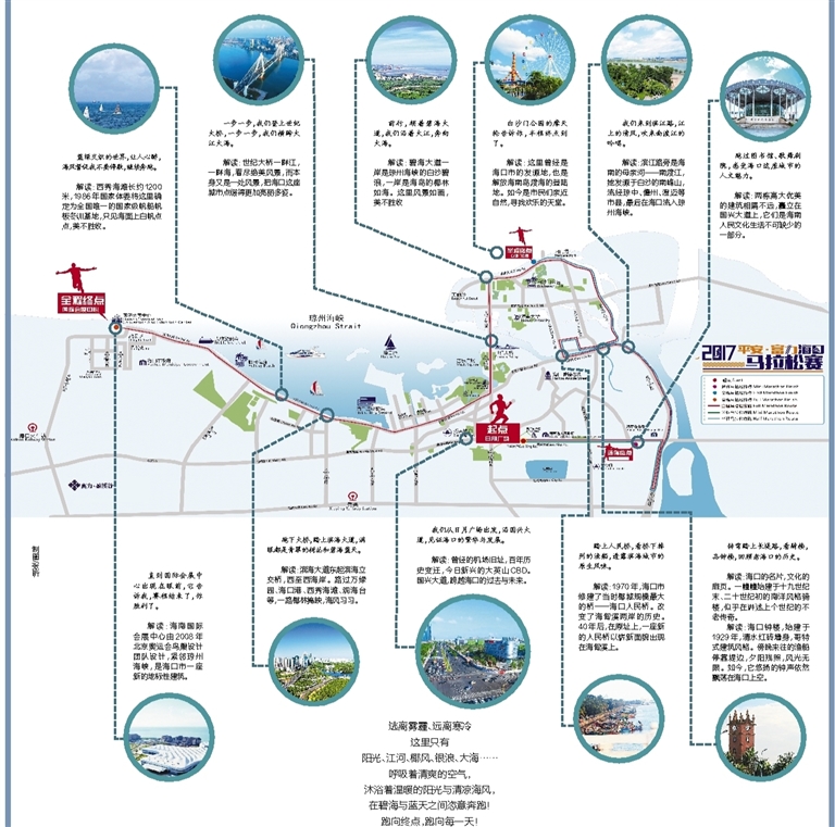 海口马拉松全程比较平缓,翻越两座大桥——人民桥、世纪大桥;路过五座公园:白沙门公园、万绿园、世纪公园、西秀海滩、假日海滩;穿行海口最古老的长堤路和最新兴的西海岸。从大江到大海,沿江约13公里,沿海约23公里,全程串联起海口最美的道路与风景。希望每位选手都能够通过这段路,认识海口、了解海口、爱上海口。
