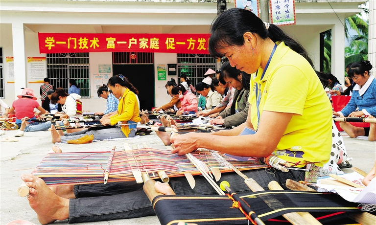 近日,保亭黎族苗族自治县三道镇三弓村,县里举行的培训班给村民和贫困户传授织锦技术。产业扶持脱贫是当地整村推进的内容之一,通过培训让村民学一门技术、富一户家庭。