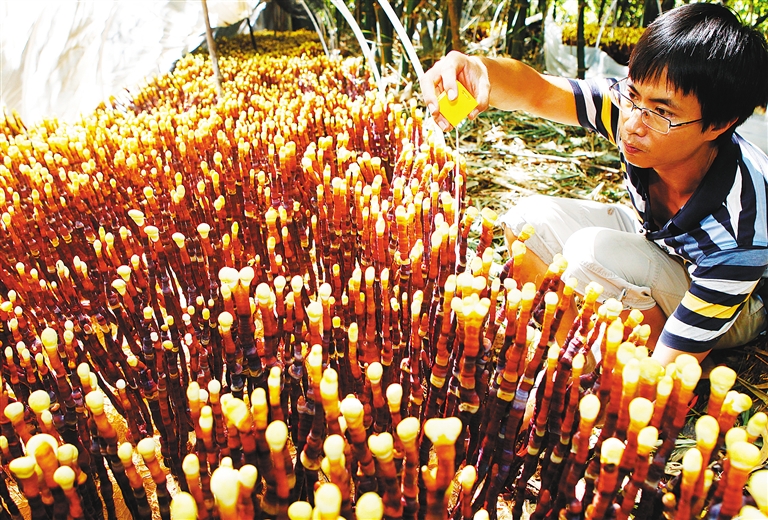 乍一看犹如甘蔗似的植物,其实是长势正旺的菌草。这种菌草打碎后装成小袋,是培养灵芝、蘑菇的主要原材料。目前,儋州菌草产业年产值已突破3000万元。