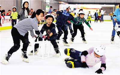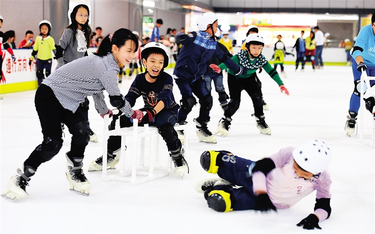 12月3日,在海口市一家室内滑冰场,儿童们在冰上尽情玩耍。 目前正是北方大雪飘飞的冬季,而生长在四季如春的海南的孩子们,只能在电视上或者到北方才能见到真正的冰雪,室内真冰滑冰场成了海南儿童追寻冰雪梦幻世界的不错选择。 新华社记者 赵颖全 摄