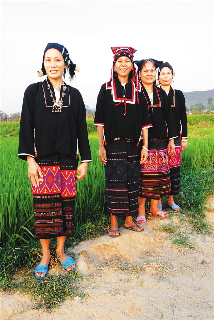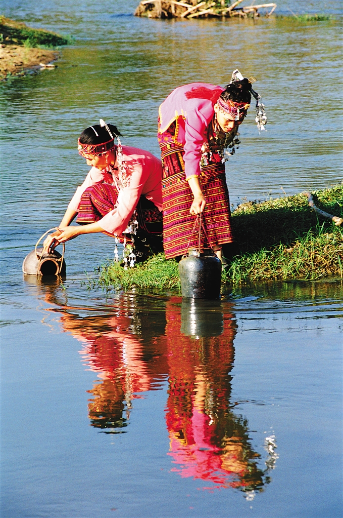黎族美孚方言妇女喜欢穿絣染长裙折在前,织花鲜艳,上衣为方领对襟,衣边绣花。该方言妇女筒裙比其他方言的妇女筒裙都要宽长。十多年前,我去东方东河拍摄黎族风情,当时我用的是胶片相机,具体拍摄时间已经记不清楚。我曾听说东河镇黎族习俗保持比较完整,于是我就去了周边的几个黎村。果真是很不错,东方村、西方村、中方村不仅黎族风俗保持完好,而且村旁的田园风光也很美,黎村映衬着远远朦胧的九龙山,村民在田园里来回走动,有的去挑水,有的去洗衣物,就像一幅优美的画卷。这时刚好来几个穿着民族服饰的黎族妇女,于是我按下了快门。