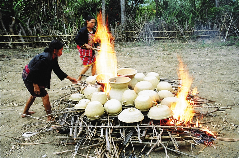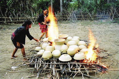 黎族原始制陶最早的记载是宋代赵汝透《清蕃志》卷下:“……以土为釜瓠为器……土釜至今用之,瓠瓢间以水……”。这一生产技艺是黎族人民长期劳动的智慧结晶,是一份宝贵的历史遗产,被一代一代传承下来。2005年,经朋友联系羊拜亮老人,我去到昌江石碌镇保突村,记录下羊拜亮老人露天烧陶的图片。之后海南用我拍摄的这一组照片去申报国家级的非遗项目成功。如今羊拜亮老人年纪大了,不能再做了,这门技艺便由她的家人继续传授。