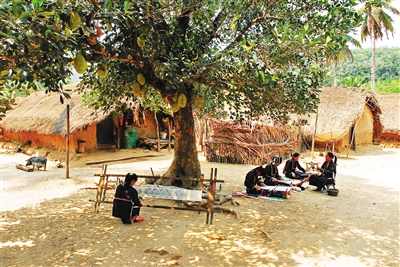 苗族迁移海南岛始于明朝嘉靖至万历年间,从广西等地作为士兵被朝廷征调到海南,撤防后一些苗族士兵落籍海南,也有一部分因谋生而移居海南岛。苗族在海南岛特定的气候与环境下逐渐形成自己独特的民族风情。《苗族睽叶蔗阳》这幅作品,是我在2007年去保亭苗村采风时拍摄的,当时正值中午,阳光较强,看见几位苗族妇女站在阳光下闲谈,其中一位年长妇女背着一个孩子,手上撑着一把用睽叶制作的遮阳伞,我想这就是海南苗族具有的特色,于是将其记录。