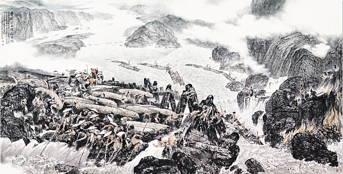 《李冰父子与都江堰》这幅作品可谓是李冰修建都江堰水利工程全过程的缩影。它不仅将烧山碎石、清理河道、运送石料、岸边立桩等治水过程呈现出来,还通过鱼咀处的汩汩河水,宝瓶口处的惊涛拍岸描绘了大自然的壮美绝阔。“现实主义讲究真实。”李锛将不同时空的劳动场景巧妙、合理地组合在一幅画中,让整体显得生动、真实,而大的线条与黑白摆布更烘托出了整个情境的气势磅礴。