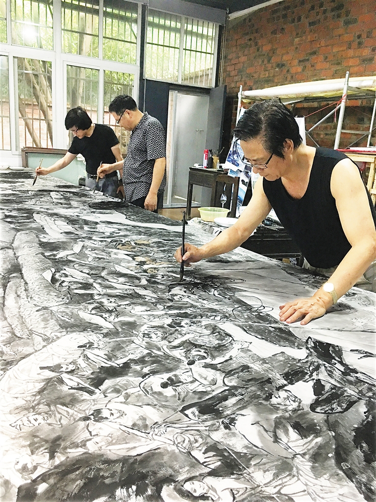 艺无止境。画家李锛早已获奖无数,退休前又是海南大学艺术学院的教授,可创作起这幅画来,他像个刚刚习画的学生一般,抱着敬畏与严谨的心态,一丝不苟地对待着每一次下笔,对待着每一寸雪白的宣纸。他的夫人余心玉向记者展示了手机里记录的创作历程,从草图到着色,6张照片清晰地记录他的修改过程,而这还仅是记录了较大的改动。李锛单是在素描稿阶段就修改上百次,最终定稿后再“抠”着色,最后才开始在定做的3.5米×5米的宣纸上作画。