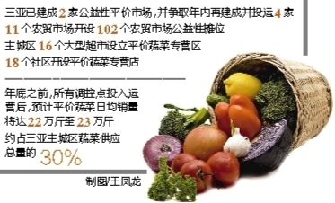 “为了应对春节菜篮子工作‘大考’,三亚正抓紧在迎宾路上建设一个平价蔬菜应急调控配送中心,合理整合冷藏及储备资源,从产、供、销、储各个环节,提前谋划,保证春节时段的蔬菜市场供应,进一步抓好‘菜篮子’建设。”三亚市物价局相关负责人说。