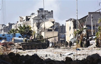 12月4日,叙利亚亲政府军武装部队在阿勒颇东部城区行进。 叙政府军自今年9月以来已经把阿勒颇东部的反政府武装包围在一个南北走向的狭长地带内。经过两个多月的包围后,叙政府军近来在阿勒颇的军事行动力度加大,目前已收复反政府武装控制区北部全部区域。新华社/法新
