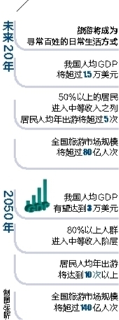 随着我国经济社会发展、居民收入增加、消费升级加快,我国居民的旅游消费能力、旅游消费需求和旅游消费群体都将大幅度持续增长。2014年我国居民人均出游超过2.5次,旅游市场规模38亿人次;未来20年,我国人均GDP将超过1.5万美元,50%以上的居民进入中等收入之列,居民人均年出游将超过5次,全国旅游市场规模将超过80亿人次,旅游将成为大多数人的普遍性消费;到2050年我国人均GDP有望达到3万美元,80%以上人群进入中等收入阶层,居民人均年出游将达到10次以上,全国旅游市场规模将超过140亿人次,旅游将成为寻常百姓的日常生活方式。