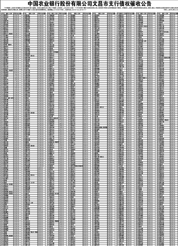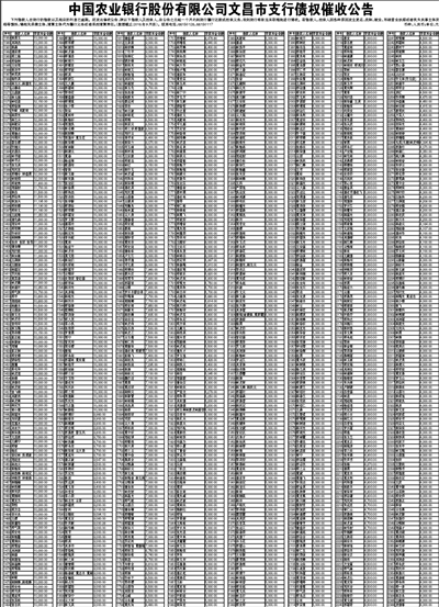 中国农业银行股份有限公司文昌市支行债权催收公告