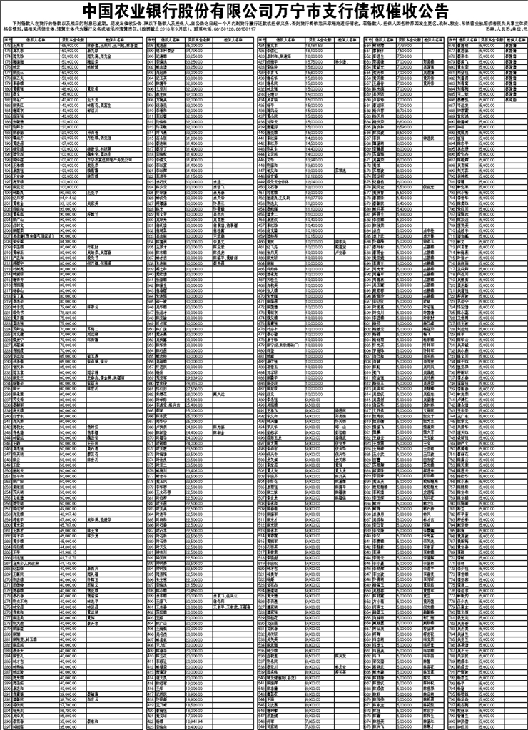 中国农业银行股份有限公司万宁市支行债权催收公告