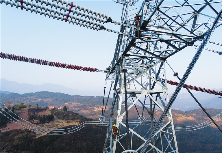 12月6日,国网重庆电力检修公司的技术人员在高空进行特高压线路塔基验收。 当日,全国最长±800千伏特高压线路——酒湖线(甘肃酒泉至湖南湘潭)在重庆巫山县开始进行验收,标志着酒湖线重庆段全面进入高海拔区域的线路验收工作。 酒泉—湖南电力线路是我国目前输电距离最长的±800千伏特高压输电工程,全长2383公里、投资262亿元,建成后将把中国西北的清洁能源送往华中地区,成为西电东送的另一条大动脉。据介绍,目前酒湖线工程全线进展顺利,已经陆续进入了验收阶段。 新华社记者 刘潺 摄