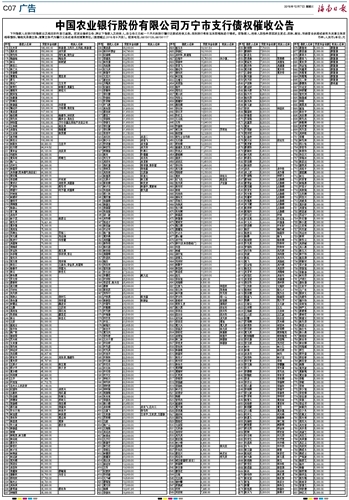 中国农业银行股份有限公司万宁市支行债权催收公告
