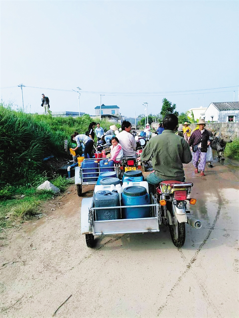 村民符修华的三轮车上放了8个桶,每天要来回拉两三趟水,才够一家人的用量。他说,有些村民家里没有三轮车,手提肩挑一天至少要来回四五趟,耽误了很多干农活的时间。