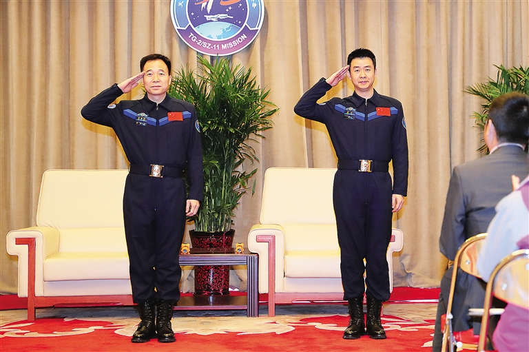 12月7日,航天员景海鹏(左)、陈冬(右)在北京航天城航天员公寓与媒体见面。 当日,神舟十一号航天员景海鹏、陈冬在北京航天城航天员公寓接受媒体记者采访,状态良好。两名航天员自11月18日返回北京后,进行了为期3周的隔离恢复。目前,他们身体重力再适应进展顺利,各项生理指标恢复符合预期目标。据介绍,隔离恢复期结束后,两名航天员将进行为期1个月的疗养,促进身体全面恢复。