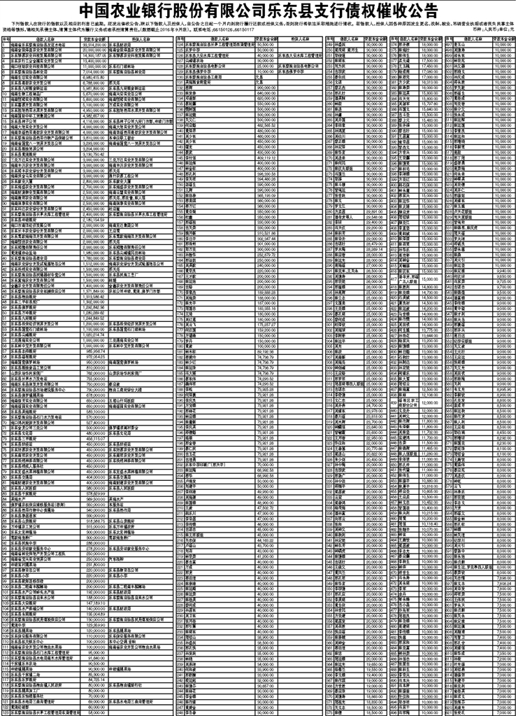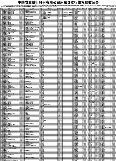 中国农业银行股份有限公司乐东县支行债权催收公告