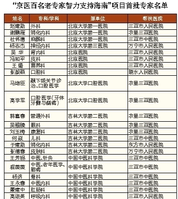 “目前报名要来海南的老专家十分踊跃,他们的热情超过了我们的预期。”朱尧耿称,首批抵达海南的22位专家分别来自北京医院、北京大学第一医院、北京大学第三医院等国家卫生计生委委属委管医院,以及中国中医科学院附属广安门医院、望京医院、西苑医院和眼科医院,包括外科、肾内科等16个急需紧缺专业。根据海南本地医院需求和专家意愿,专家将分别到省农垦三亚医院、三亚市人民医院、三亚市中医院、万宁市人民医院、陵水人民医院和东方市人民医院进行为期1个月到半年的帮扶。