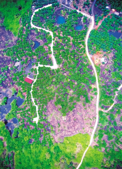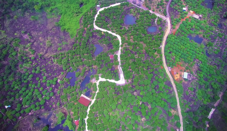 海南日报记者航拍到105亩的荔枝园,周边的道路与荔枝树围成的形状酷似一只“小恐龙”,史前生物居然“现身”海南,哈哈,有没有被萌到呢?请大家猜猜这只“小恐龙”在哪?