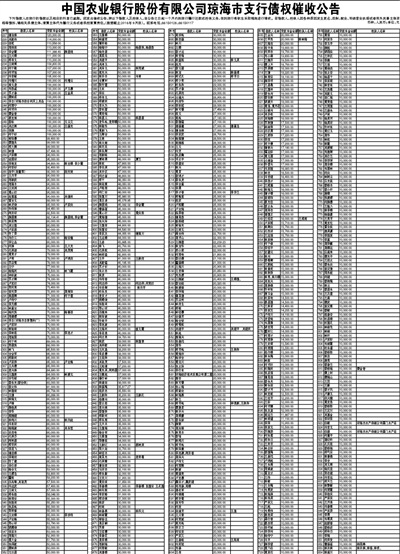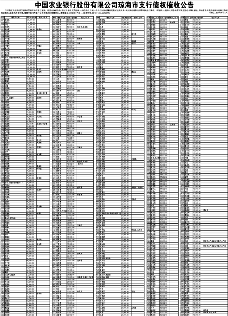 中国农业银行股份有限公司琼海市支行债权催收公告
