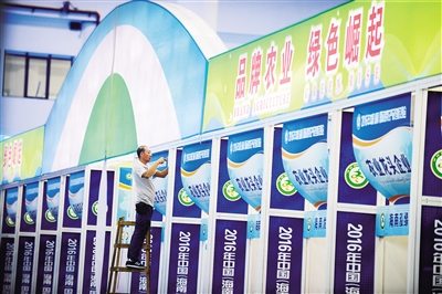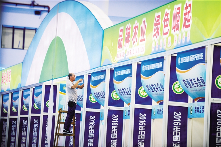 12月9日,海南国际会展中心,工人师傅们忙着铺设展馆。本报记者 袁琛 摄