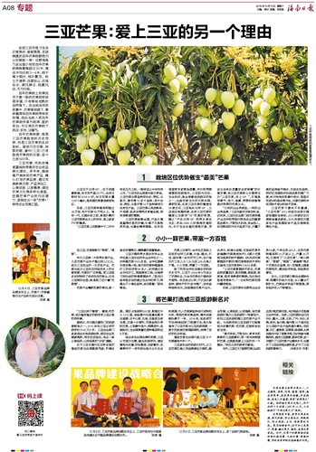 三亚紧扣全民旅游大时代,以三亚芒果区域公用品牌建设为契机,融合发展,以果促旅、以旅强果,将芒果旅游打造为三亚旅游的一张新名片,依托三亚旅游助推三亚芒果产业升级。今后游客到三亚旅游不仅能够观光采摘芒果、吃芒果,还能体验农家生活。