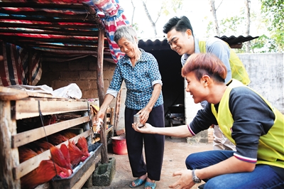 海口市美兰区三江镇魁斗二村,75岁的贫困户吴月凤在喂鸡。在团海口市委的帮扶下,吴月凤养殖了32只鸡和2头水牛,再过一个月就可以带来可观的收入。