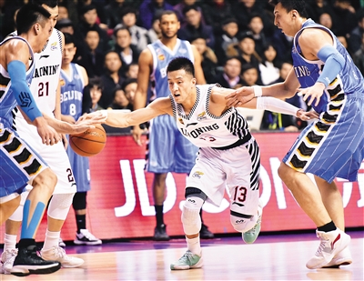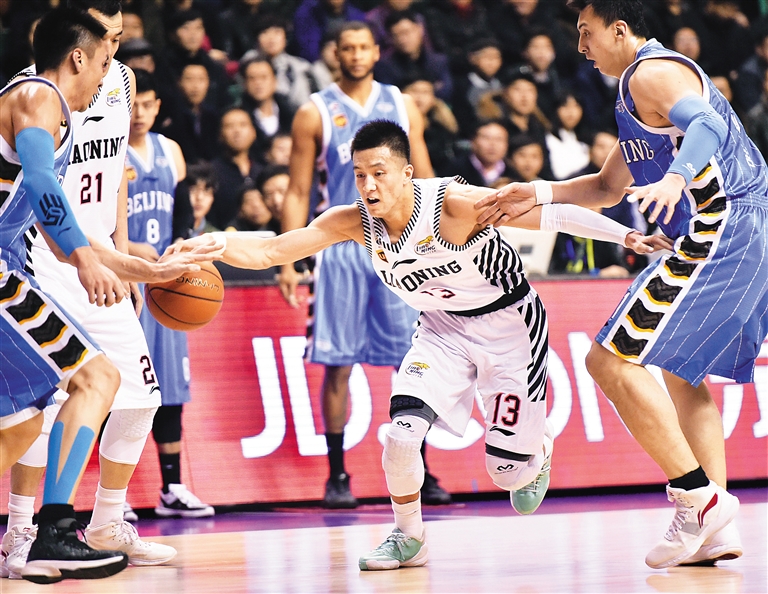 12月11日,在CBA第16轮比赛中,辽宁队主场以108:96战胜北京队。图为辽宁队球员郭艾伦(中)在比赛中进攻。 新华社发