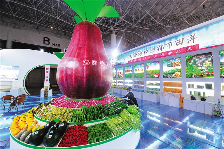 12月11日21时许,海南国际会展中心,工作人员在海口馆检查水果摆放。今年冬交会主会场总面积8万平方米,设置38个展馆展区,新增设了公益性展馆、脱贫农产品展销区、农业金融服务展区等。本报记者 袁琛 摄