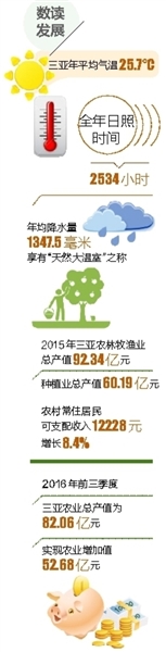 “我市目前已经形成了以热带水果、冬种瓜菜、热带花卉、畜牧养殖、海洋渔业、南繁育种和休闲农业共同发展的格局。”三亚市副市长李劲松介绍,近年来,三亚坚持创新驱动,大力推进品牌农业建设,转方式、调结构、树品牌、促融合,依靠南繁育种的科技优势,打造国家冬季瓜菜生产基地,建设中国的农业“硅谷”,向科技要效益,重点发展优质高效农业。