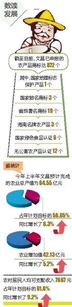 椰子、文昌鸡、罗非鱼、航天瓜菜、水芹菜、紫番薯……提起文昌的农业品牌,文昌市农业局的负责人如数家珍:“文昌是农业大市,全市GDP总数的40%来自于农业,这些品牌是文昌农业竞争力之所在。”