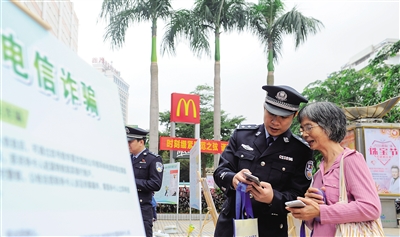 12月11日,海口市明珠广场, 民警为市民详细解答如何防范电信诈骗、被骗后如何及时止付等知识。