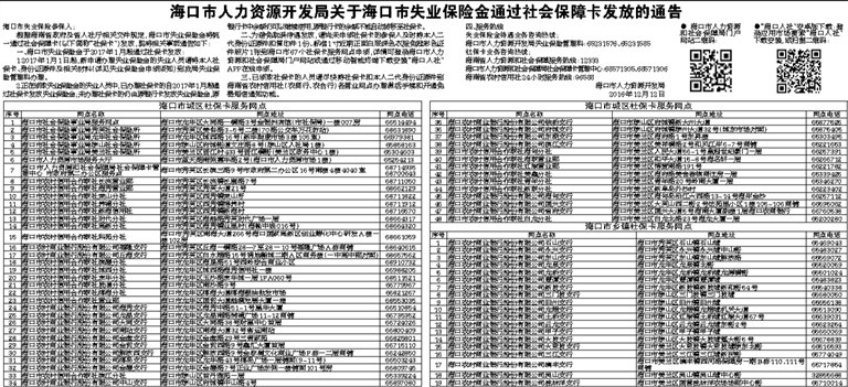 海口市人力资源开发局关于海口市失业保险金通过社会保障卡发放的通告