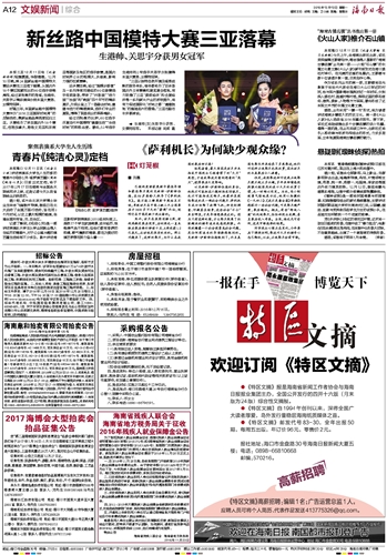 | 欢迎在海南日报 南国都市报刊登广告 |