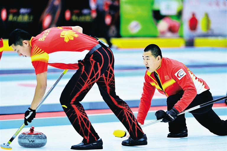 12月12日,在青海多巴国家高原体育训练基地举行的中国青海国际冰壶邀请赛第二轮比赛中, 图为中国队选手刘锐(右)在比赛中。 新华社发
