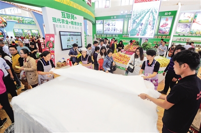 昌江展馆的工作人员现场制作蚕丝被,引得人们驻足观看。