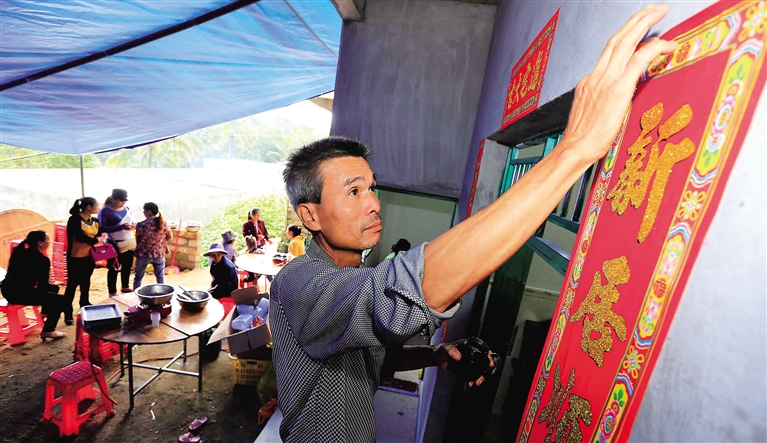 12月13日,在琼中黎族苗族自治县红毛镇上托村,贫困户王积忠兴高采烈地在自己的新宅上贴乔迁对联,邀请亲戚朋友前来庆祝自己的乔迁之喜。