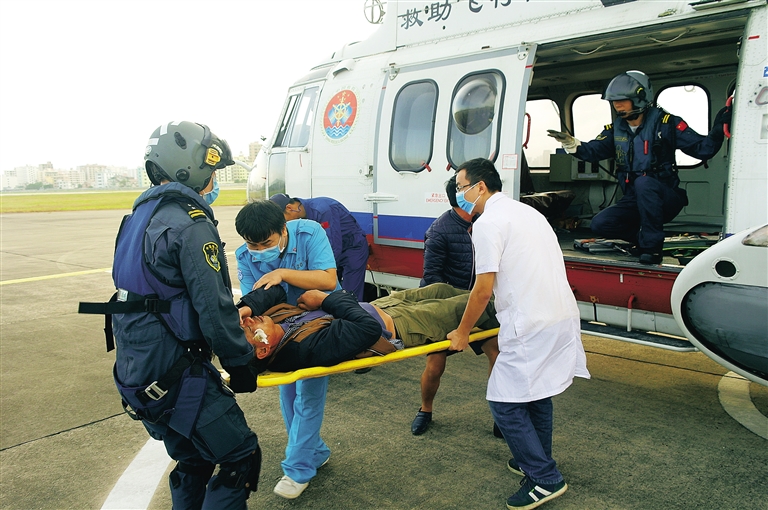 12月12日上午,交通运输部南海第一救助飞行队B-7137救助直升机,在三亚市西南方向约80海里海域处,将一名在作业中头部受伤的渔民接到三亚进行救治。