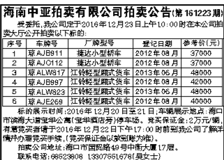 海南中亚拍卖有限公司拍卖公告