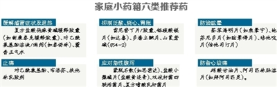 朱刚直建议,药箱中药物配备应根据家庭成员的年龄、健康状况、季节来配备。家中如有患慢性病的老年人,应备齐平时必服药物,尽管家中尚未发现冠心病人,但只要有老人就应该备有抗心绞痛的药物,以防万一。家中如有儿童,应考虑配备用于治疗感冒、发烧、腹泻、牙痛的药物。家中如有青少年,还需配备一些外伤皮肤消毒和止血药物。春季药箱应备些抗过敏药,夏季备些防中暑及防蚊虫叮咬药,秋季备些止泻药,冬季备些防治感冒、哮喘、胃病的药品。此外,药箱中还应该有一些常用的小器械,如血压计、听诊器、体温计等。