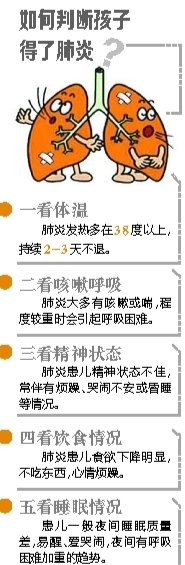 据介绍,肺炎是小儿较常见的一种呼吸道疾病,主要表现有发热、寒战、咳嗽、喘息、气促、呼吸困难等症状。孩子在冬季和春季患肺炎较多。肺炎分为轻症和重症,家长如果没有足够的重视,儿童普通肺炎很容易转重症,尤其是针对1岁以内、免疫功能低下的幼儿。