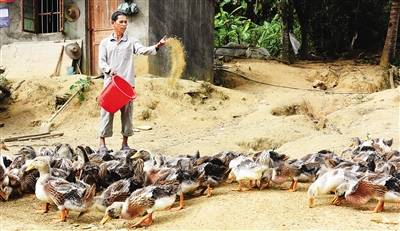 五指山市畅好乡番贺村委会志毛村小组贫困户黄海川将今年五指山市有关部门扶持的鹅苗、鸡苗等家禽养大卖掉后,尝到甜头转变观念,由“要我脱贫”变为“我要脱贫”,10月底自己又买了200只鸭苗,准备在春节前出售,预计纯收入不低于4000元。本报记者 武威 通讯员 王国军 摄