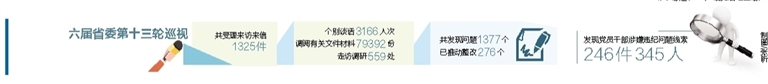 今年8月至10月,六届省委第十三轮巡视派出16个巡视组对50个单位(地区)党组织开展巡视,共发现问题1377个,已推动整改276个;发现党员干部涉嫌违纪问题线索246件345人。至此,本届省委共开展13轮巡视,提前实现了中央确定的本届省委任期内巡视全覆盖的目标。