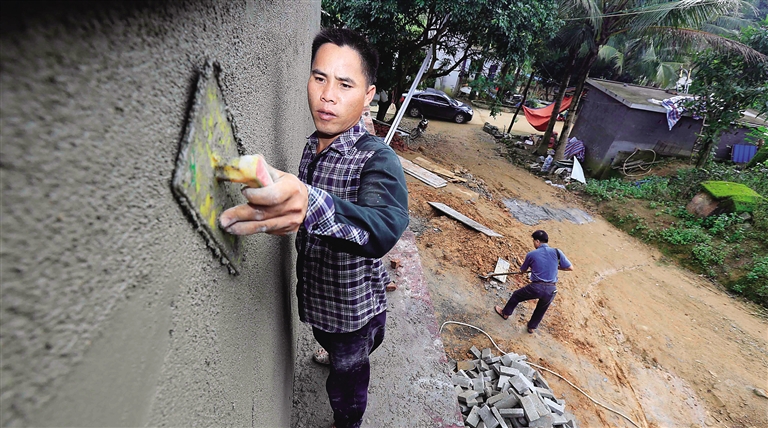12月13日,在琼中黎族苗族自治县红毛镇金屏村委会金屏村,贫困户危房改造施工热火朝天,部分村民赶着加紧装修以便能在春节前搬迁入住,在新家里过新年。