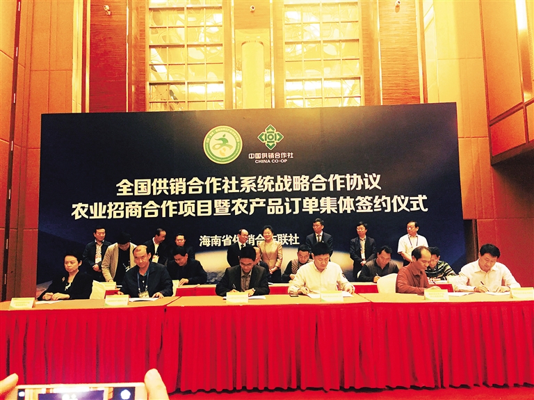在全国供销合作社系统战略合作协议农业招商合作项目暨农产品订单集体签约活动中,全国各地供销系统批发商与海南各市县特色农产品种养合作社以及农业企业签合同及意向合同累计达128宗,数量72.75万吨,成交金额29.73亿元,成为本届冬交会上海南特色农产品最大采购团。