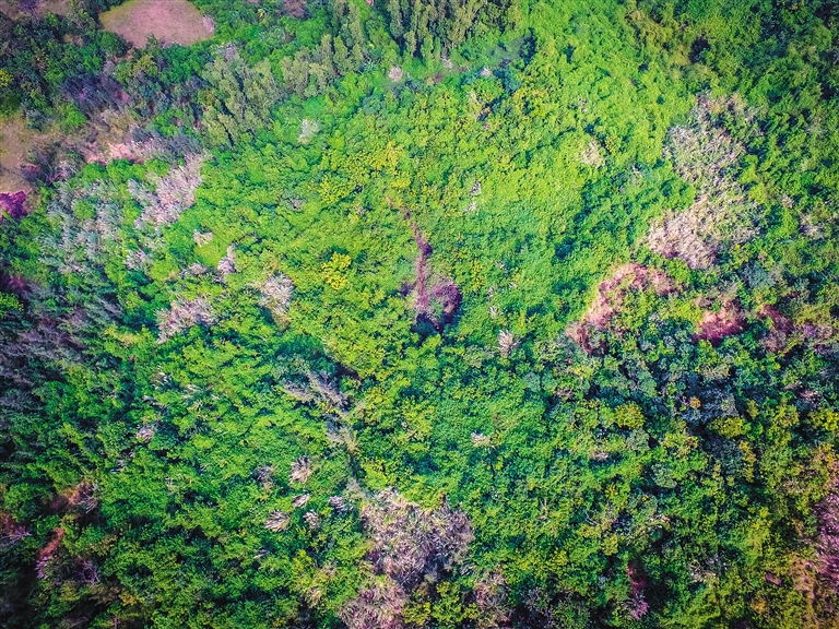 今天上午,4名村民用竹刀劈山开道,艰难地带领本报记者与省国土资源厅退休干部李福在尚天山附近的密林中行走了两公里左右,终于来到这处“大坑”。李福多年来致力于雷琼地区火山研究,他曾探访过海南岛大部分火山口。